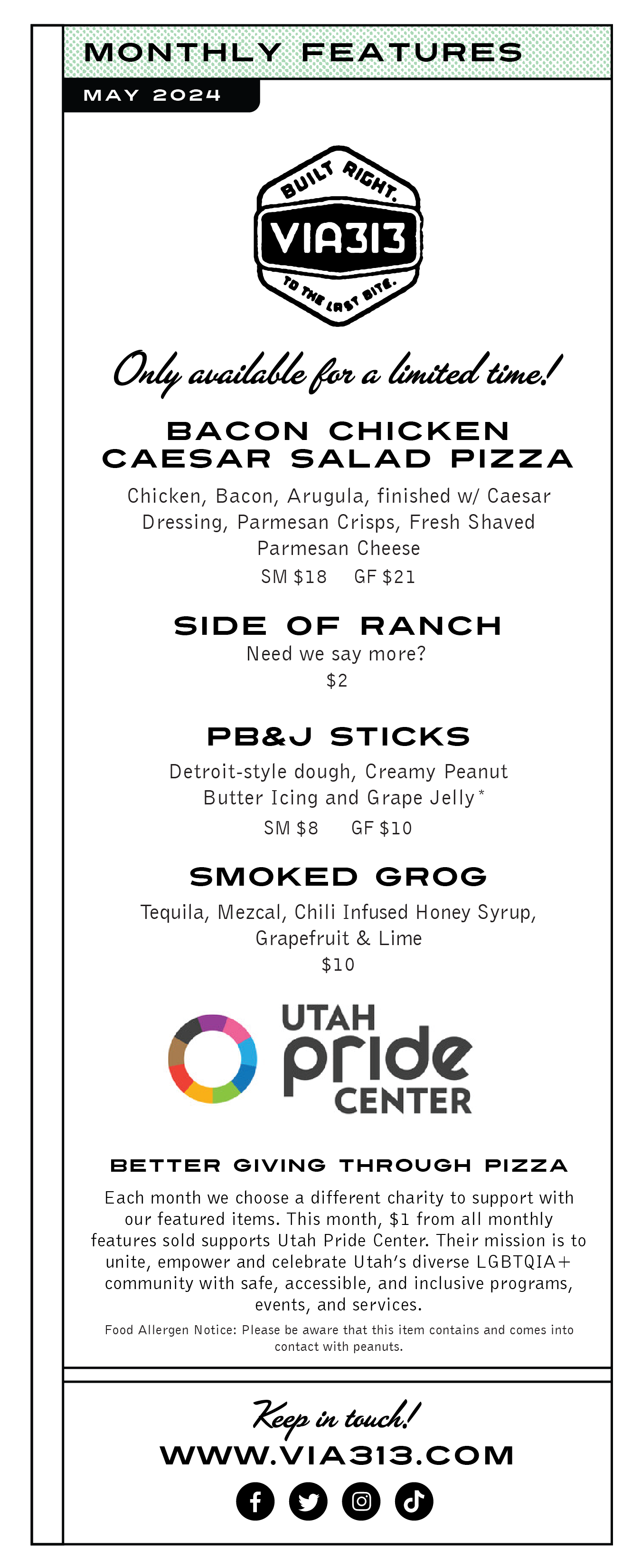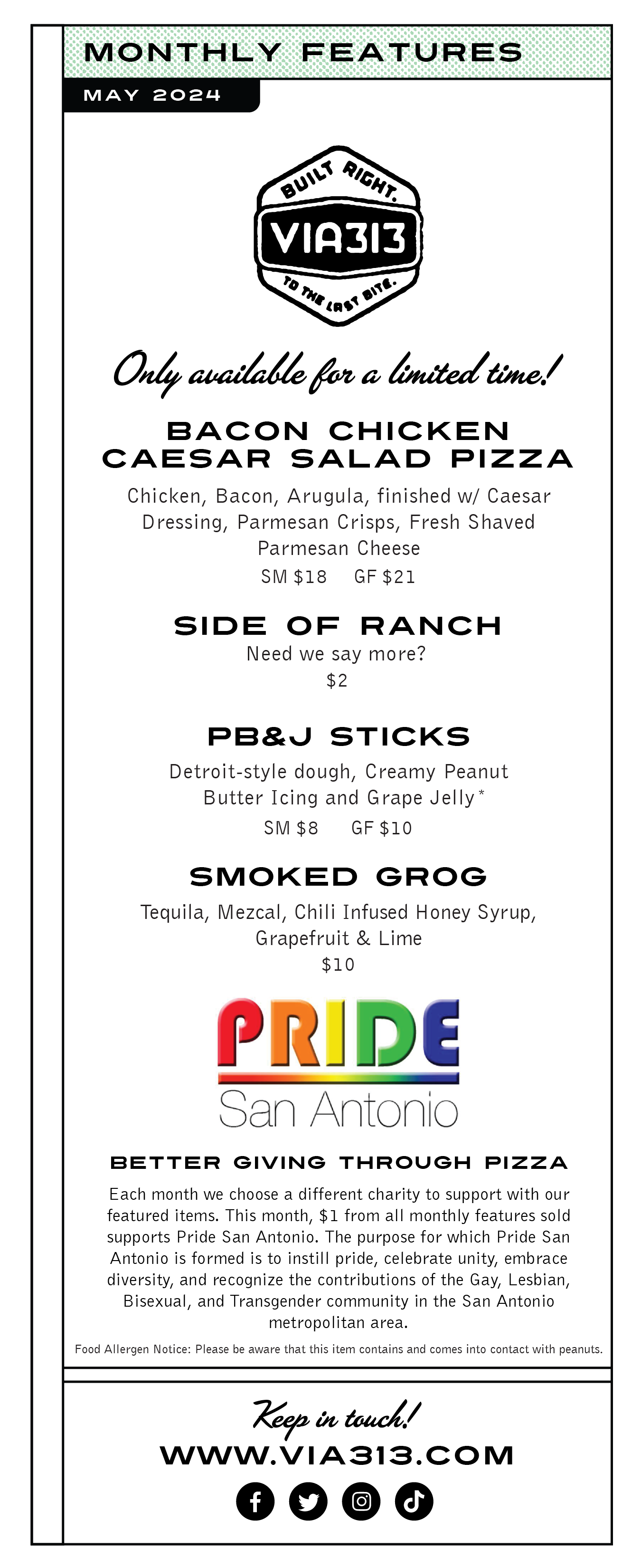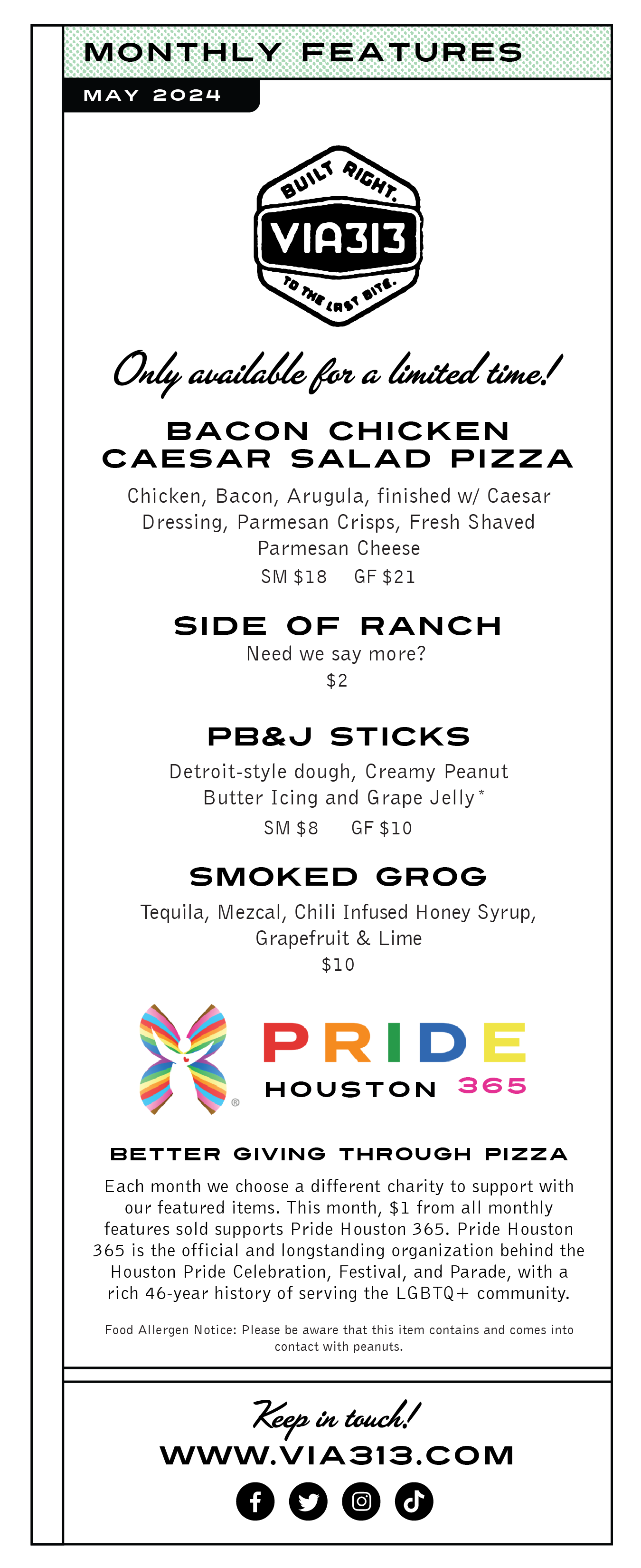 ON ALL DETROIT STYLE PIZZAS. (V) = VEGETARIAN